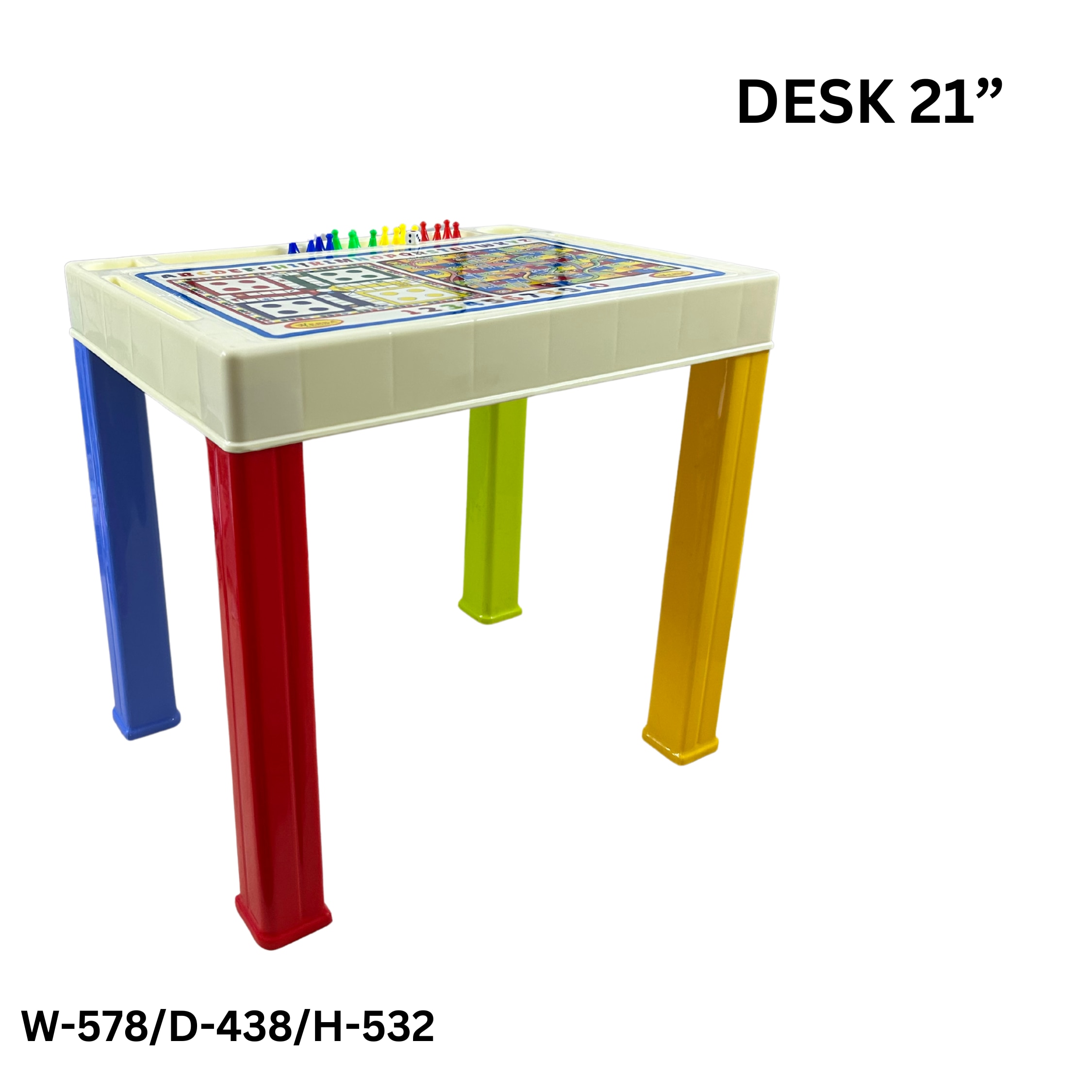 Introducing the versatile “Desk 21”", the perfect workspace for growing minds! This sturdy and colorful desk provides a dedicated space for homework, crafts, and games. The durable, non-toxic plastic construction is easy to clean, while the vibrant multi-colored legs add a fun touch to any room. With a built-in Ludo board, it offers both learning and leisure in one compact design. Ideal for schools and homes. Product Code: W-578/D-438/H-532