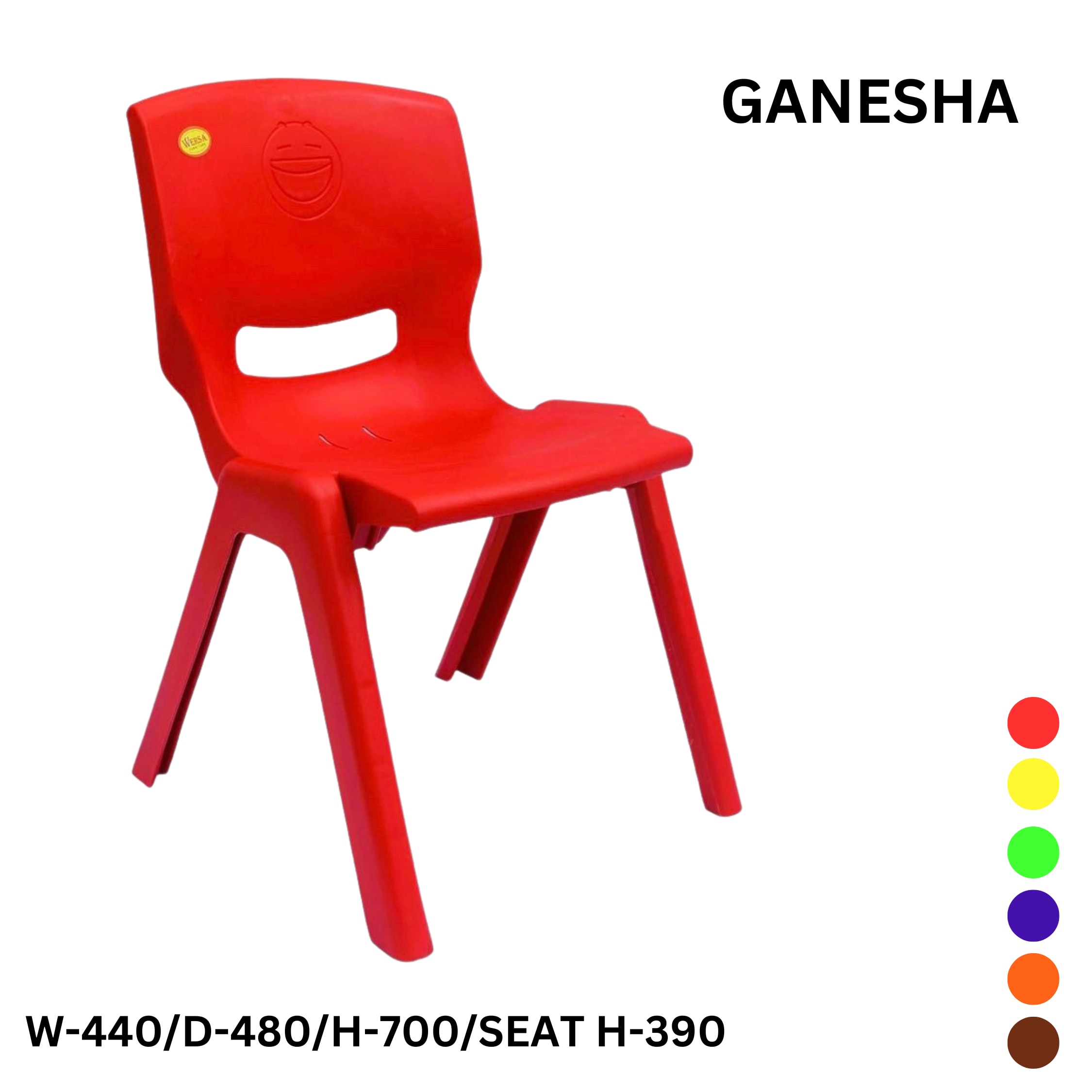The “Ganesha Chair” is a durable and stylish seating option for children, featuring a friendly Ganesha design on the backrest. Made from high-quality, non-toxic plastic, this chair is built to withstand active use while providing a safe and supportive seat. Its ergonomic design and vibrant colors make it a perfect fit for any playroom, classroom, or home. Product Code: W-440/D-480/H-700/SEAT H-390 Available Colors: Red, Yellow, Green, Blue, Orange, Brown